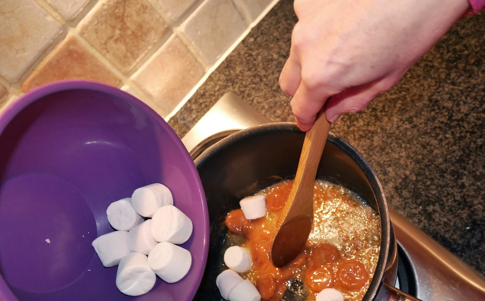 4. Once the rice krispies are covered in toffee and marshmallows, pour the mixture into a tray. Make sure the mixture isn’t too thin; you don’t want it to break when it comes to cutting out the shapes.