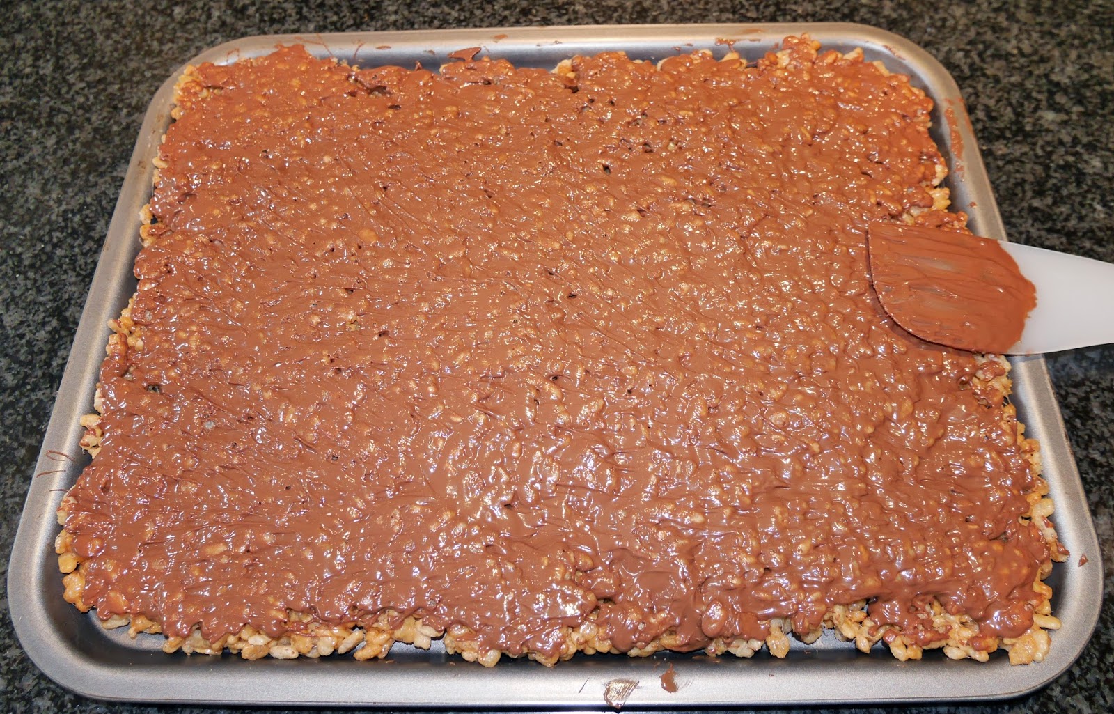 6. Cover the tray of crispie with the chocolate once it’s melted, using a spatular to spread it across.