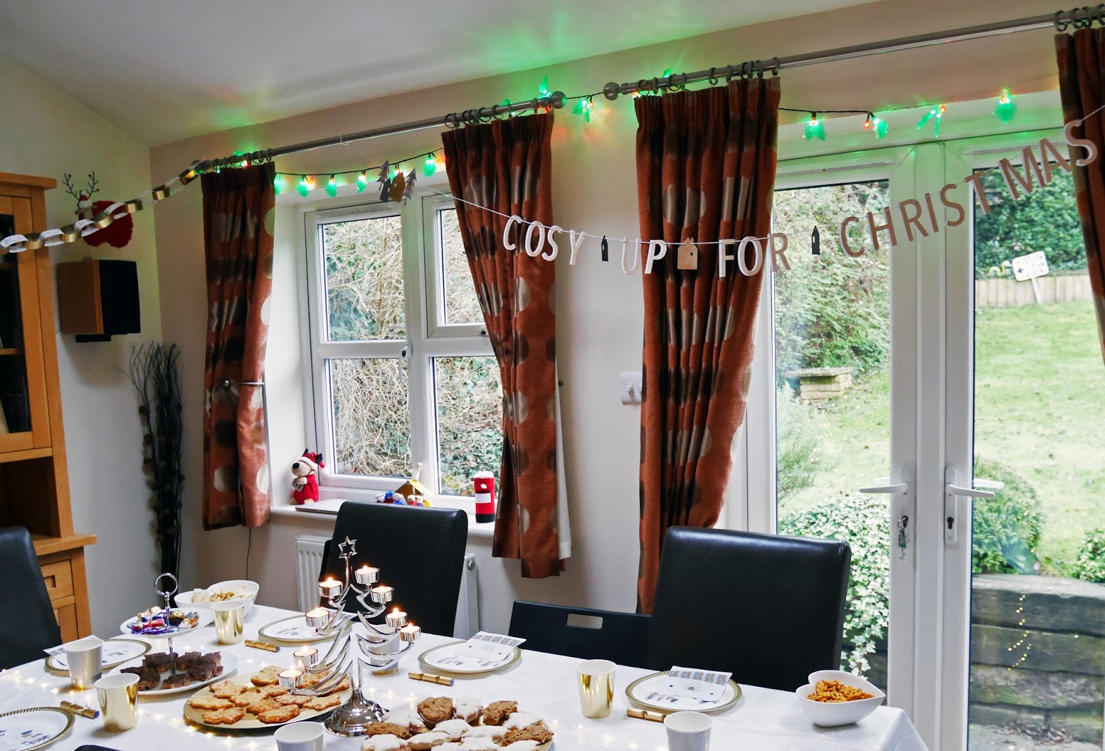 Yesterday, I put on my Christmas jumper, some red lipstick and a fairy lights necklace. My hairdresser came over late morning and she cut my hair before plaiting it back in a different style to normal. With my hair done, I felt ready for the party, so we started getting the last few bits together.